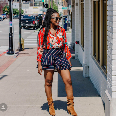 A skirt that is fitted at the waist and flares out towards the hem, which is short and ends above the knee.